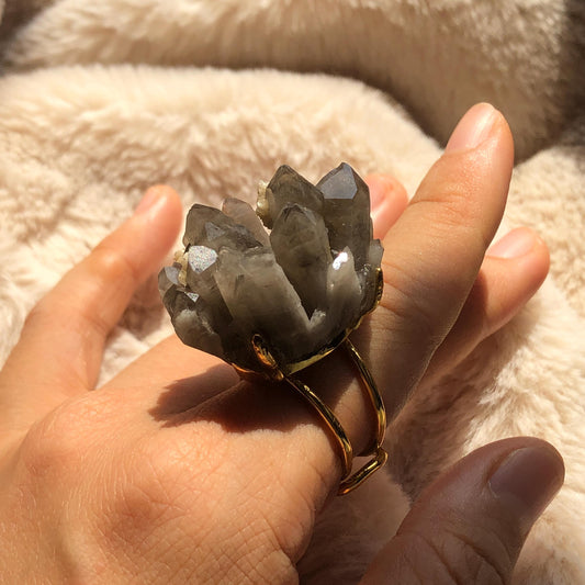 Raw Smoky Quartz & Calcite Crystal Ring | Decision-making Stone